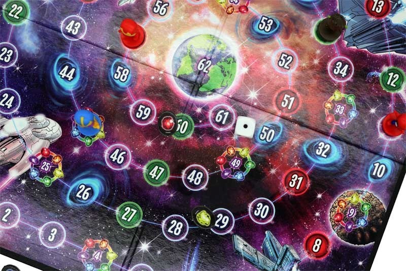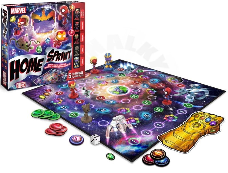 In this cooperative game you will fight with Thanos to get the stones from him. Players will roll the dice to move forward on their journey to Earth, but be aware that some steps may trigger actions such as losing a stone or gaining a stone from Thanos, or fighting Thanos. When each player reaches Earth, you must fight Thanos one last time. Roll the dice, add your tokens to improve your strength and compare it with his roll, the highest can steal the stone for the other.